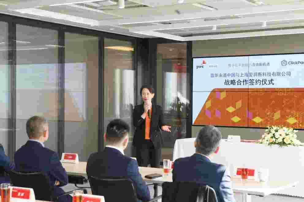 普华永道中国风险及控制服务数字化鉴证和分析服务主管合伙人吕麟晖与美团钱包商家版首席产品官马俊代表双方签订战略合作协议,,普华永道中国上海主管合伙人黄佳与美团钱包商家版创始人、、CEO胡柏见证战略合作协议签订过程。。。。普华永道中国创智中心合伙人林榕作为项目总负责人主持并见证了本次战略合作签约仪式。。。
